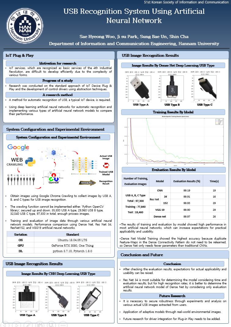 IoT 디바이스의 Plug in Play를 위한 기본 모듈로서 대표적인 유선 인터페이스인 USB 인식 모듈을 개발하였다. 효과적인 USB 인식을 위하여 심층 인공신경망을 포함한 다양 한 인공신경망의 성능을 실험을 통하여 비교하였다. 인공신경망을 훈련하기 위한 충분 한 양의 데이터를 확보하기 위하여 크롤링 기법과 Open CV 이미지 회전 및 상하좌우 반전 기법을 사용하였다. 대부분의 인공신경망에서 높은 성능을 보여주었으며 Dense net에서 99.97%의 정확성을 얻을 수 있었으며, 실제 적용 가능성과 활용성에 대한 기대 치를 높일 수 있었다. 실제 촬영 USB 이미지의 평가 정확도를 확인 후 인식 모델의 신 뢰성도 한 단계 더 발전시킬 수 있을 것으로 기대할 수 있다.
