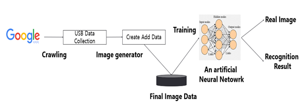 충분한 양의 이미지를 확보하기 위하여 Crawling을 통해 USB 이미지를 가져오고, 설계 하는 인공지능 신경망을 충분히 학습시키기 위해서 충분한 양의 데이터가 필요하기에 Open CV 라이브러리를 이용하여 USB 이미지를 추가생성 후 인공신경망을 통해 훈련 한다. 훈련된 인공신경망을 이용하여 USB 이미지에 대한 인식 결과를 도출한다.