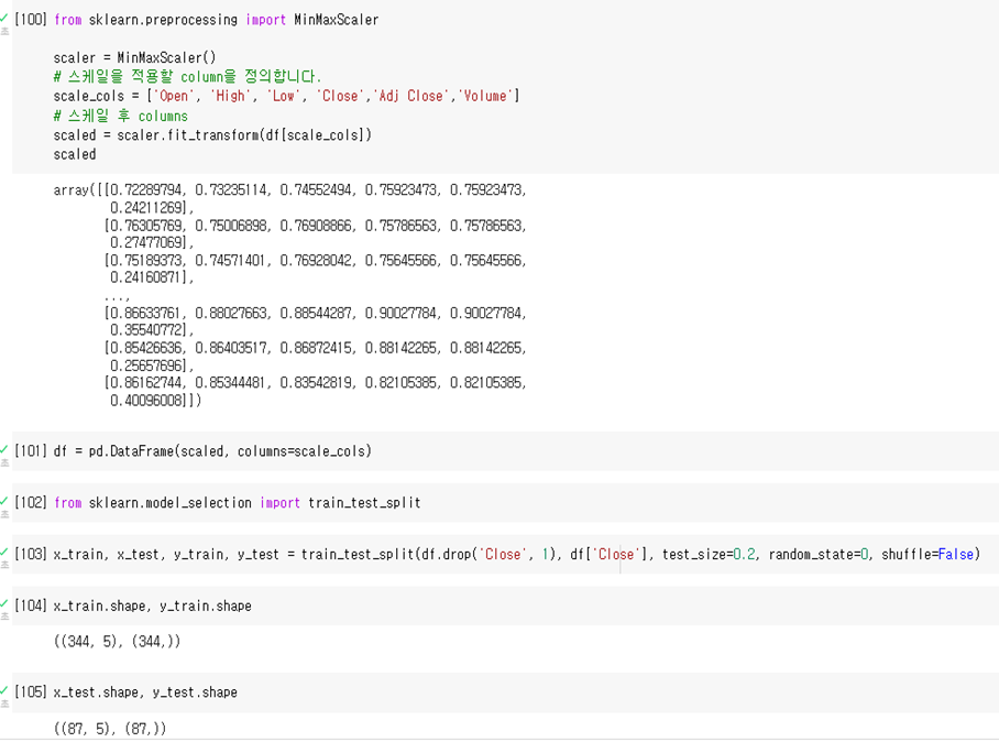 ->스케일에 적용할 Column을 정의하고 x,y의 훈련과 테스트 데이터를 8:2로 나눠 저장한다