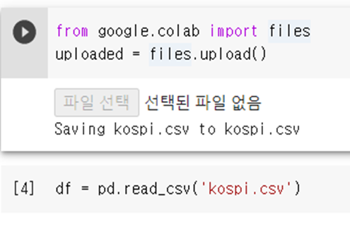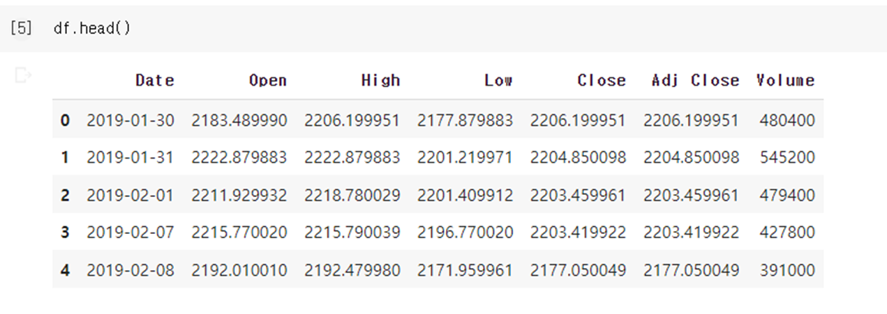 -> head()를 통하여 'Kospi.csv’ Date 날짜 Open 시가 High 고가 Low 저가 Close 종가 Adj Close 조정 종가 Volume 거래량