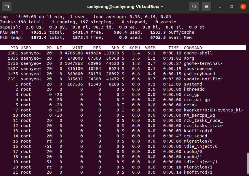 - TIME+ : 프로세스가 사용한 토탈 CPU 시간